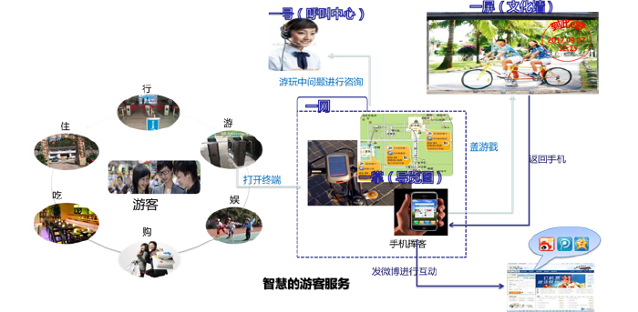 为景区管理部门提供智慧的景区管理应用,如视频监控、交通及客流量监控、导游、旅行团定位、虚拟旅游、景区推介、应急设施物资定位、景区信息推送、信息发布、报送和救助、救援等。 (6)智慧的企业营销