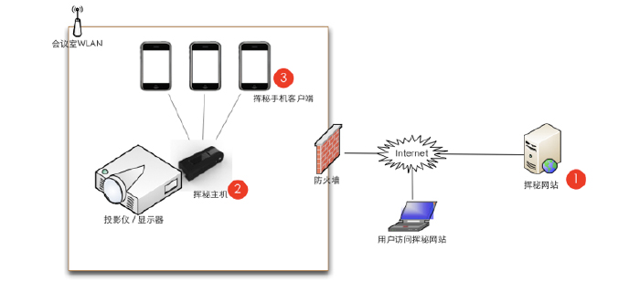 挥秘特点去电脑化:演讲幻灯片准备好后将幻灯片上传到挥秘网站即可;演讲时通过云端下载幻灯片演讲。 云端化:通过“文库”功能,挥秘已经实现云端幻灯片存储。在电脑上制作幻灯片,上传到云端,然后在手机打开“文库”功能下载使用即可。 无线遥控:演讲者可以随意走动,并深入听众中进行互动,在网络覆盖范围内不用在意遥控距离的问题。 三屏会议:按照演讲时的场景将整个演讲分成“三块屏幕”,分别是:演讲者手持终端的屏幕、投影仪屏幕、听众手持终端的屏幕。所谓三屏会议的意思是,以上三块屏幕上的内容和功能是分开的、差别化的,演讲者的屏幕上具有遥控功能、重点标记功能;投影仪屏幕则主要负责显示、展现,受演讲者屏幕遥控;听众屏幕则除了接收演讲者屏幕遥控外,还可以记录笔记、向演讲者提问等。演讲者还可以事先准备一些演讲提示,这些提示只有自己能够看到。 双屏会议:在小型的即时会议中可能缺少投影仪,这时候就可以使用双屏会议功能,听众从演讲者手机上直接下载到幻灯片,而演讲者则直接遥控听众。 幻灯片分享:方便的幻灯片共享,听众随意获取演讲幻灯片,还可以将幻灯片分享给其他不在场的用户。 挥秘现有三种销售方案,简单的比较见下表: