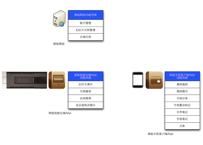 挥秘的功能模块有:本地幻灯片查看功能、幻灯片笔记(文字、涂鸦)记录功能、幻灯片文件交换功能、演讲涂鸦同步功能、幻灯片共享功能、文库(云端)管理模块、移动终端设置模块、投影仪端设置模块、投影仪端幻灯片管理模块、云端账户模块等。